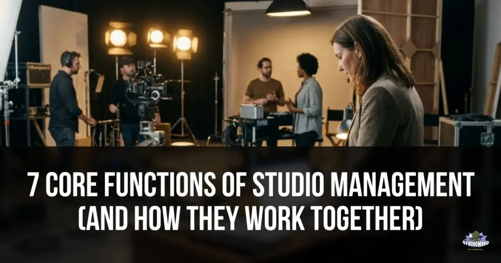 The seven core functions of studio management are scheduling and booking, equipment and resource management, financial management, production and project management, team and crew management, client and relationship management, and media asset management. Each function covers a specific operational domain, and all seven are interconnected. A failure in any single function creates cascading effects across the others.